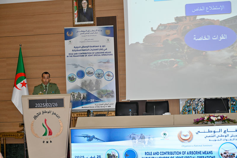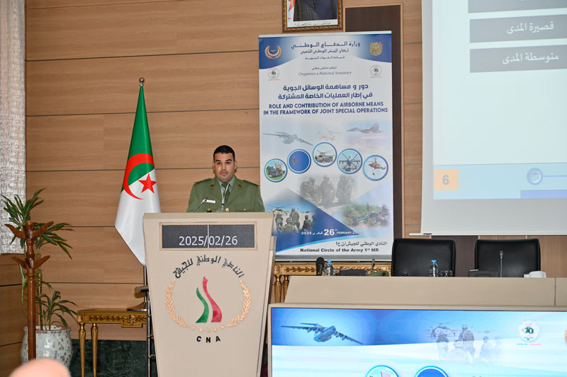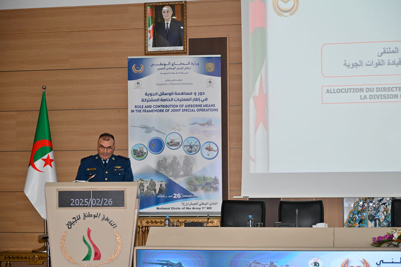 تحت إشراف السيد اللواء الزوبير غويلة، قائد القوات الجوية، نظمت قيادة القوات الجوية، قسم الحوامات / ق ق ج، ملتقى وطني حول دور ومساهمة الوسائل الجوية في إطار العمليات الخاصة المشتركة، على مستوى النادي الوطني للجيش/ن.ع1 بتاريخ 26 فيفري 2025، في إطار تنفيذ التوجيهية السنوية للتحضير القتالي لسنة 2025/2024.