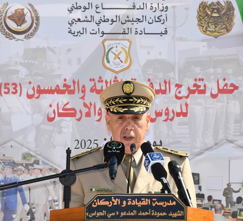 أشرف السيد اللواء أحسن مساهل، رئيس أركان القوات البرية، ممثلًا للسيد اللواء مصطفى سماعلي، قائد القوات البرية، يوم 19 جوان 2025، بمدرسة القيادة والأركان «الشهيد حمودة أحمد المدعو سي الحواس»، على مراسم حفل تخرج الدفعة الثالثة والخمسون (53) من دروس القيادة والأركان، التي حملت هذه السنة إسم الشهيد "عبد الرحمن مولود".