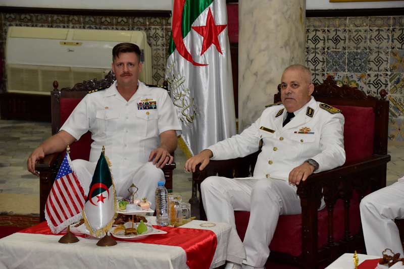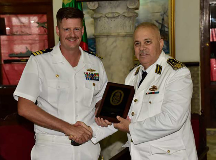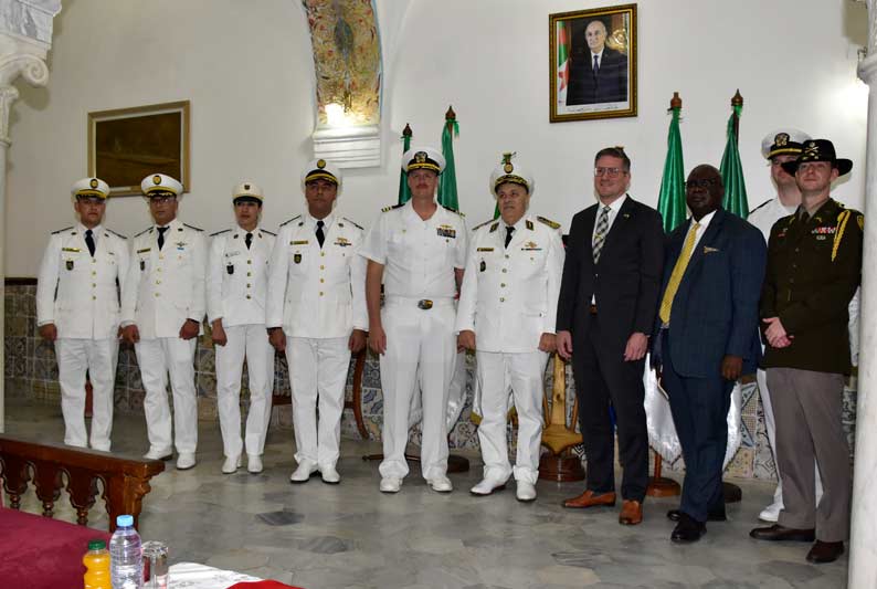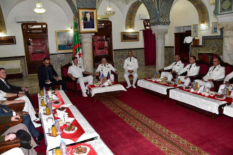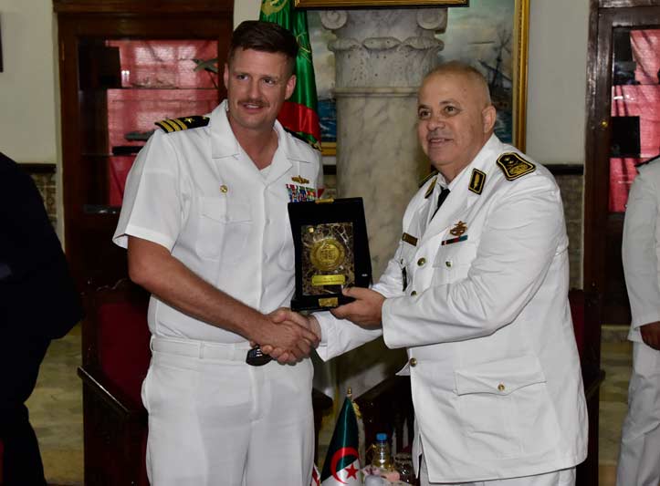 During this stopover, and at the Algiers Naval Base headquarters in the 1st Military Region, the Chief of the Mission, along with the accompanying delegation, paid a courtesy visit to the Brigadier General, Commander of the Central Maritime Front in the 1st Military Region, where the two parties discussed ways to strengthen bilateral cooperation and exchange expertise between the Algerian and American navies.