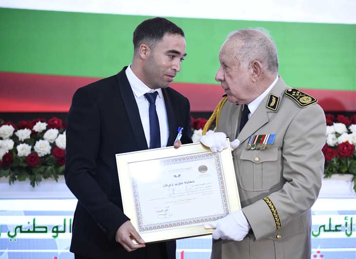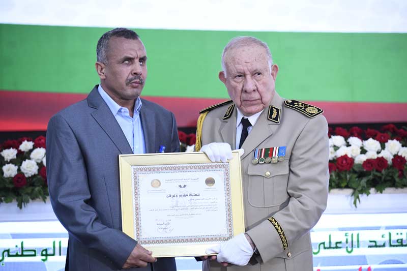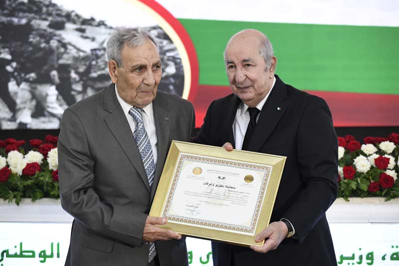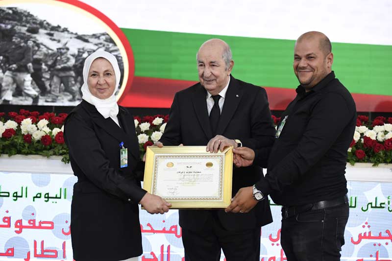 إثر ذلك، قام السيد رئيس الجمهورية بتكريم متقاعدي الجيش الوطني الشعبي المنحدرين من صفوف جيش التحرير الوطني وعائلات شهداء الواجب الوطني ومعطوبي وكبار جرحى الجيش الوطني الشعبي في مكافحة الإرهاب من خلال إسدائهم شهادات تكريم وعرفان، وذلك قبل أن يأخذ صورة تذكارية مع المكرمين.