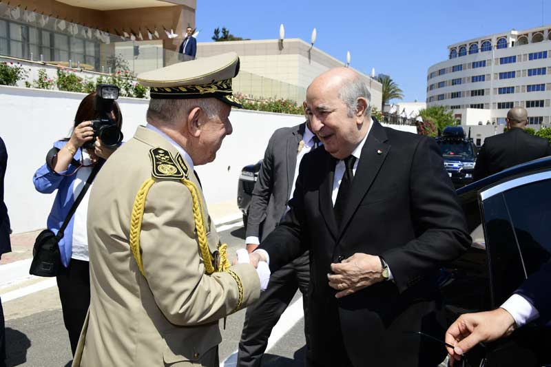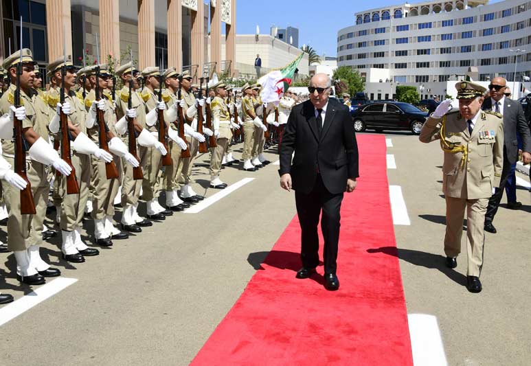 كان في استقبال السيد رئيس الجمهورية، السيد الفريق أول السعيد شنڨريحة، الوزير المنتدب لدى وزير الدفاع الوطني، رئيس أركان الجيش الوطني الشعبي أين أدت له تشكيلة عسكرية التحية الشرفية.
