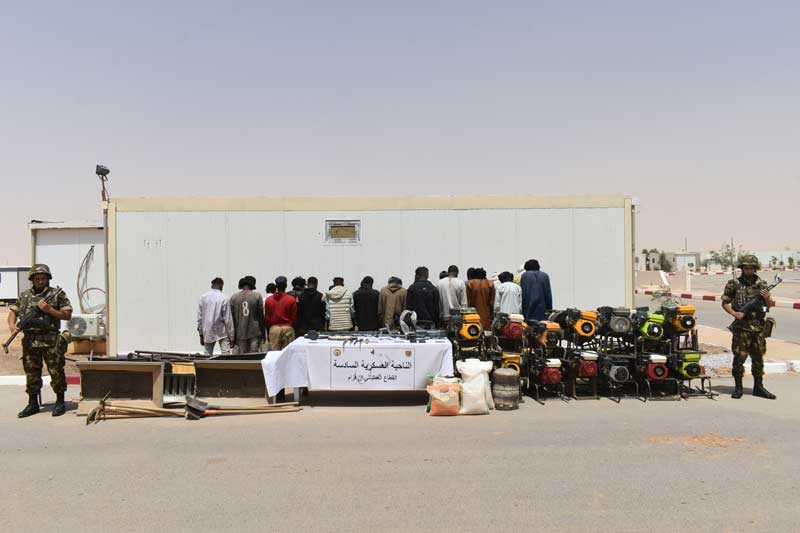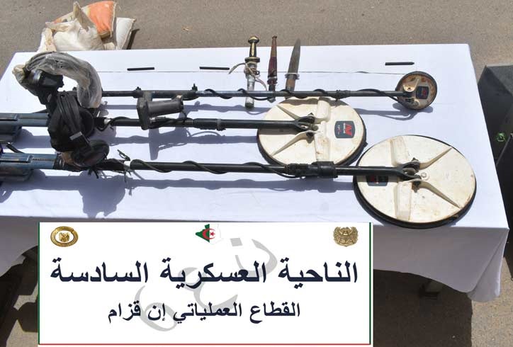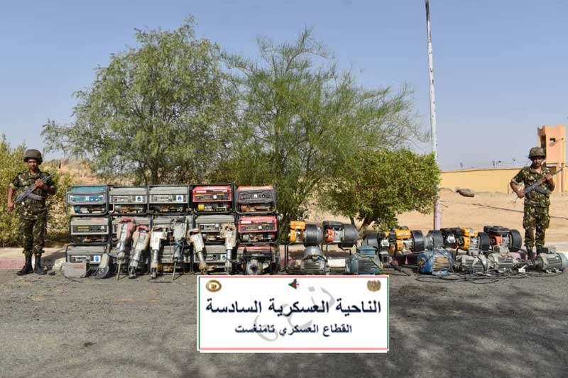 وبكل من تمنراست وبرج باجي مختار وإن صالح وإليزي، أوقفت مفارز للجيش الوطني الشعبي (270) شخصا وضبطت (23) مركبة و(158) مولدا كهربائيا و(63) مطرقة ضغط و(4) أجهزة كشف عن المعادن، بالإضافة إلى كميات من خليط خام الذهب والحجارة وتجهيزات تستعمل في عمليات التنقيب غير المشروع عن الذهب، في حين تم توقيف (11) شخصا آخر وضبط (7) بنادق صيد و(17.035) لتر من الوقود، بالإضافة إلى (6) قناطير من مادة التبغ، وهذا خلال عمليات متفرقة.