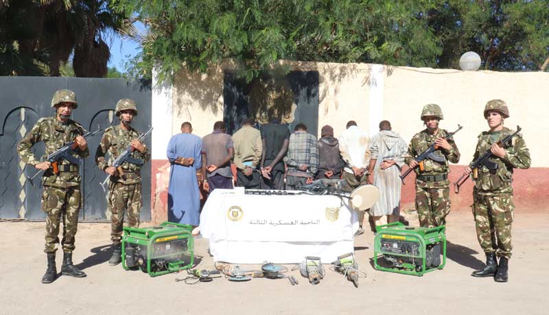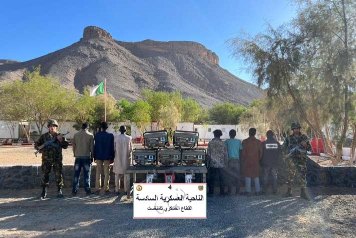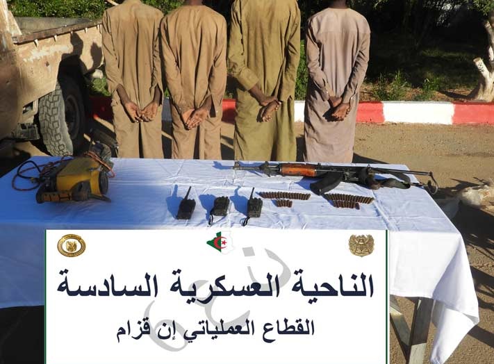 وبكل من تمنراست وبرج باجي مختار وإن قزام وإليزي وجانت، أوقفت مفارز للجيش الوطني الشعبي (186) شخصا وضبطت (27) مركبة و(296) مولدا كهربائيا و(164) مطرقة ضغط، بالإضافة إلى كميات من خليط خام الذهب والحجارة وتجهيزات تستعمل في عمليات التنقيب غير المشروع عن الذهب، في حين تم توقيف (14) شخصا آخر وضبط بندقية (1) رشاشة من نوع FMPK و(3) مسدسات رشاشة من نوع كلاشينكوف و(6) بنادق صيد و(27.440) لتر من الوقود، بالإضافة إلى (10) أطنان من المواد الغذائية الموجهة للتهريب والمضاربة، وهذا خلال عمليات متفرقة.