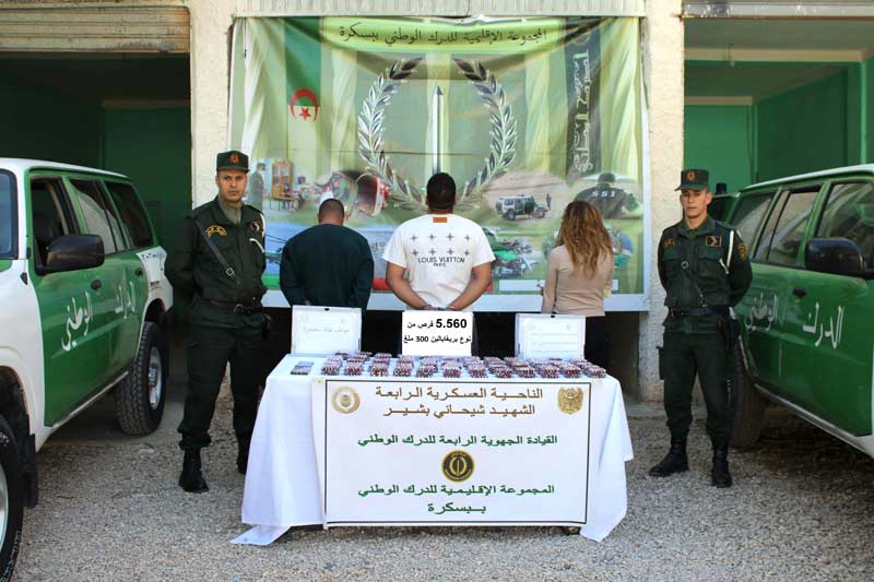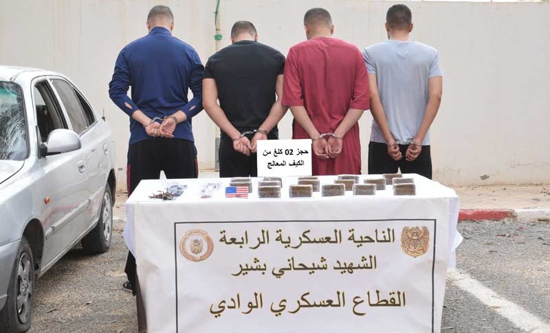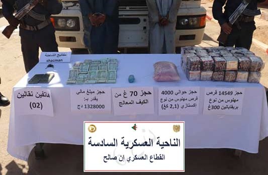 وفي إطار محاربة الجريمة المنظمة ومواصلة للجهود الحثيثة الهادفة إلى التصدي لآفة الاتجار بالمخدرات ببلادنا، أوقفت مفارز مشتركة للجيش الوطني الشعبي، بالتنسيق مع مختلف مصالح الأمن خلال عمليات عبر النواحي العسكرية، (51) تاجر مخدرات وأحبطت محاولات إدخال (7) قناطير و(21) كيلوغرام من الكيف المعالج عبر الحدود مع المغرب، فيما تم ضبط (155.978) قرص مهلوس.