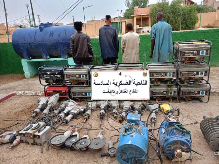 A Tamanrasset, Bordj Badji Mokhtar, In Guezzam et In Salah, des détachements de l'Armée Nationale Populaire ont arrêté (160) individus et saisi (51) véhicules, (73) groupes électrogènes, (71) marteaux piqueurs, ainsi que des quantités de mélange d’or brut et de pierres, d'explosifs, d'outils de détonation et d'équipements utilisés dans des opérations d'orpaillage illicite. De même, (16) autres individus ont été arrêtés et deux (2) pistolets mitrailleurs, (4) pistolets automatiques, (9) fusils de chasse, ainsi que (30.754) litres de carburants, (9) quintaux de tabacs et (82) tonnes de denrées alimentaires destinées à la contrebande et la spéculation ont été saisis, lors de différentes opérations.